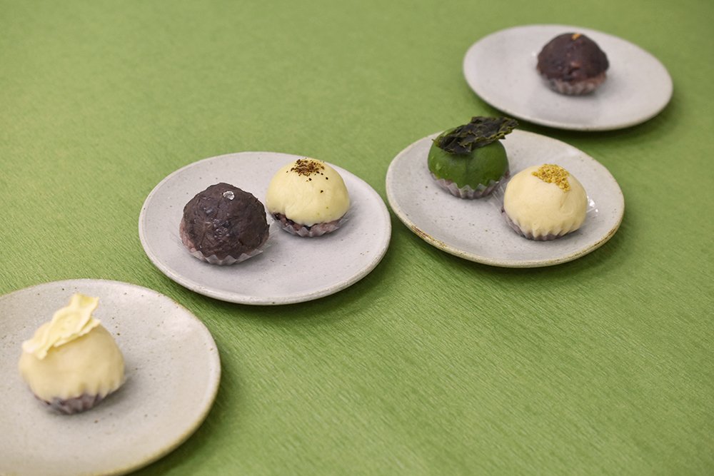 ディナー同様、和×フレンチというコンセプトで和菓子をつくりたいと思い立ったシェフが、サイズや形を自由に変化させバリエーションをつけやすいという観点からおはぎに目をつけ、開発をはじめたのが商品化のきっかけ。