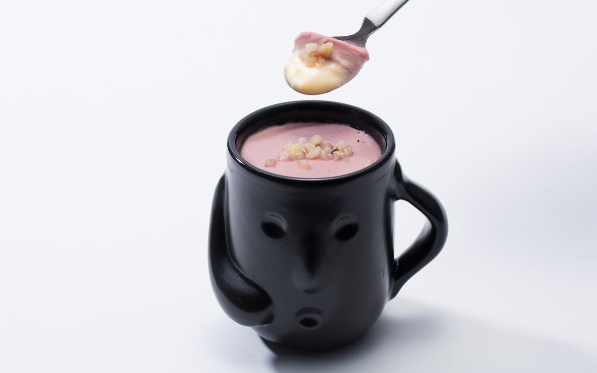 黒はにわに入ったピンク色のぷりんは、ヨーロッパ直輸入のルビーチョコレートのカカオ豆をたっぷり練り込んだクリームぷりん。