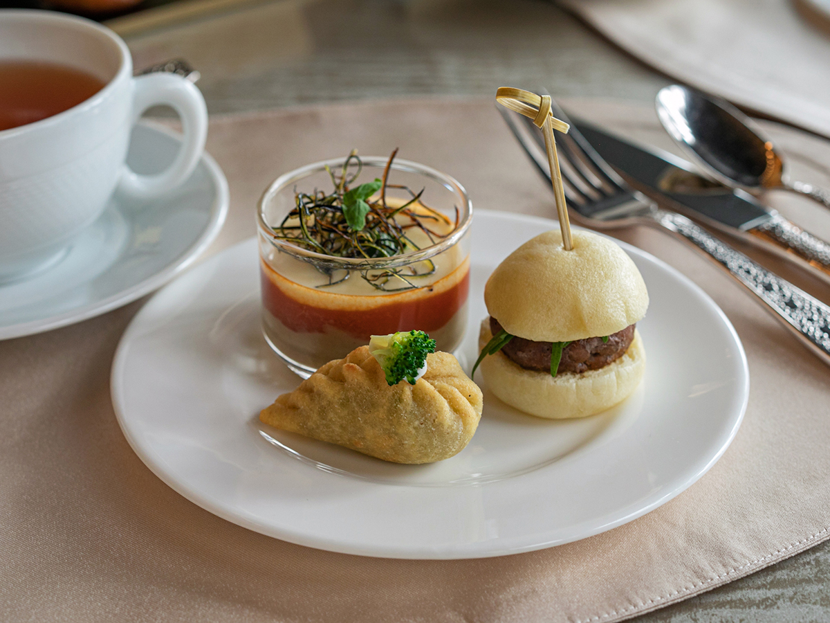 こちらは、セイボリーの一部。どれも繊細でコンテンポラリーな技がキラリと光ります。写真奥の「茄子とトマトとパルミジャーノ」には、ナスを線状にスライスして揚げたものがトッピングされていて、視覚的にも味覚的にも、とてもユニーク。写真中は、ブロッコリーとサルシッチャのラビオリ。写真右は、ミニハンバーガー。五感を刺激してくれるアフタヌーンティーといっても、過言ではありません。