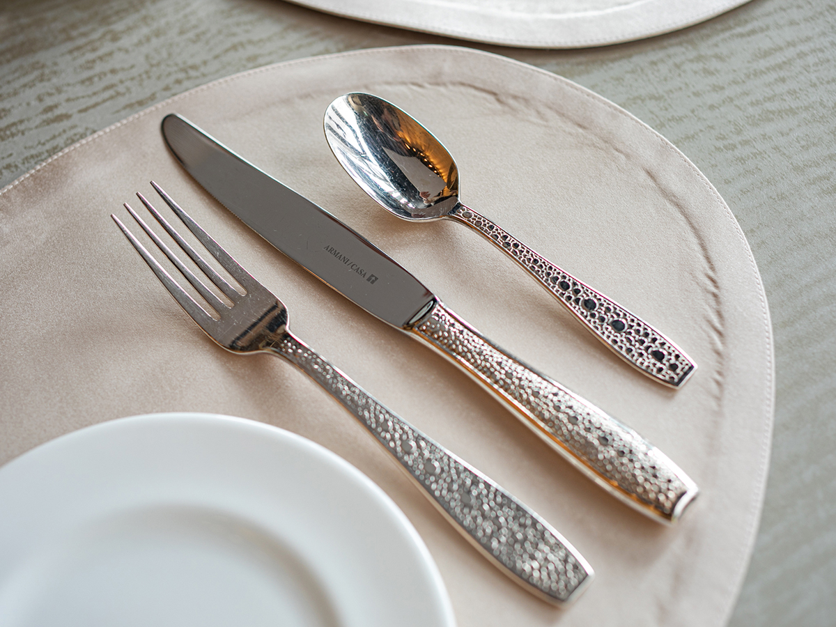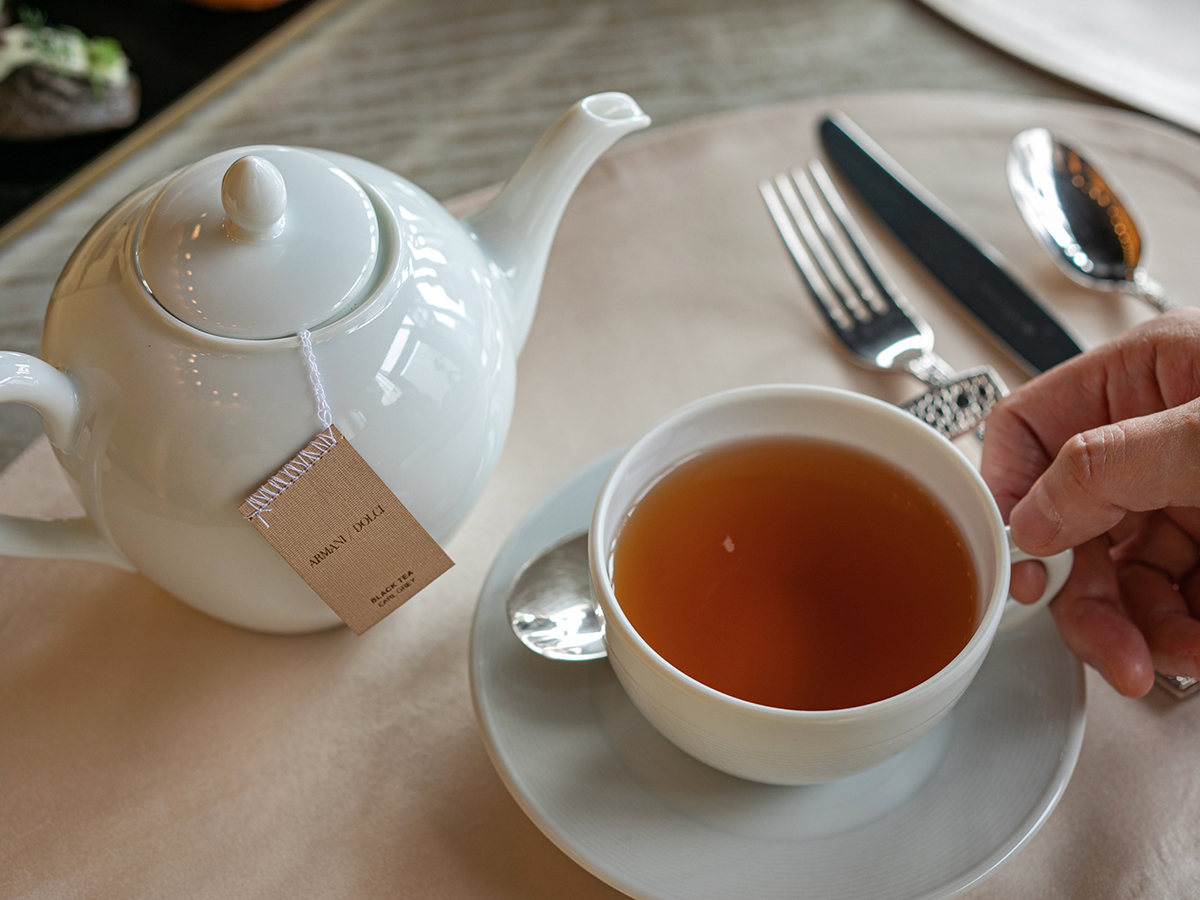 ちなみにこちらのカトラリーも、「アルマーニ / カーザ」のもの。細部にまでアルマーニのスピリットが宿ったアフタヌーンティーを楽しむことができます。