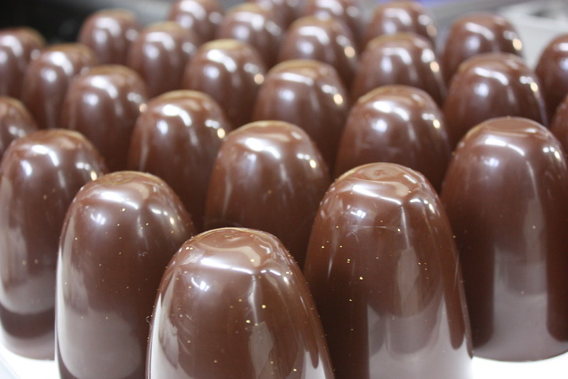 チョコレートグラスは、パティシエ柳正司氏によるオリジナル作品。ビールと相性の良いカカオ55%のチョコレートを使っています。このように、気泡が入らないように細心の注意を払いながら、1個1個手作業で仕上げています。グラスの内側にハケでチョコレートを塗り、その後は、何度かに分けてチョコレートを流し入れることで、少しづつ厚みを出していきます。
