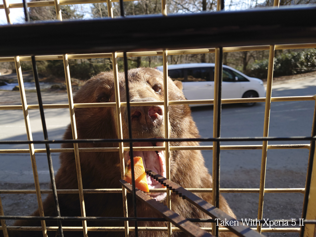 動物たちとフォトジェニックな写真を撮るのに最適なスポットにはXperia 5 IIが欠かせません!Xperia 5 IIは、ソニーのデジタル一眼カメラ α™などの本格カメラの操作性や機能を追求したフォト撮影専用機能「Photography Pro」を搭載。シャッタースピードやISO感度、ホワイトバランスなど、細かいマニュアル設定ができて、本格的なカメラと同じような撮影体験が可能です。エサをぱくりといただくクマのキュートな表情もこんなに綺麗に撮れました!