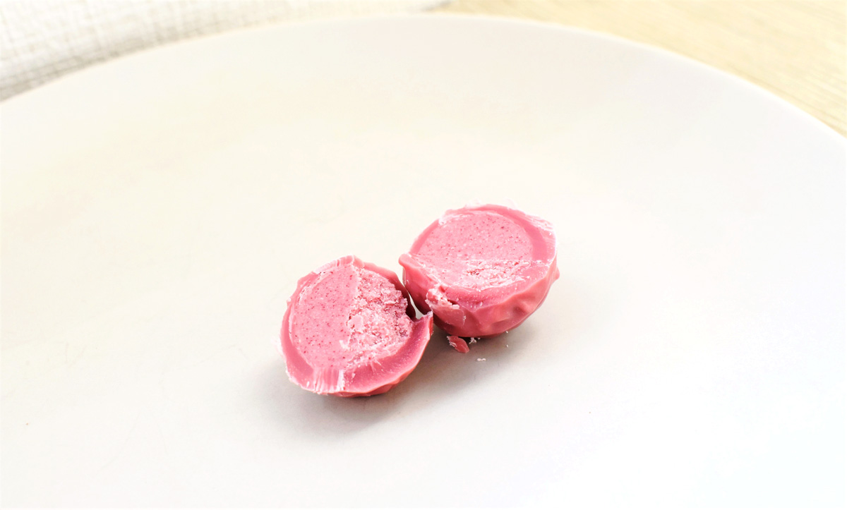 ラズベリーとシャンパンが香るガナッシュを、ルビーチョコレートで包んだもので、外側も内側もきれいなピンク色。