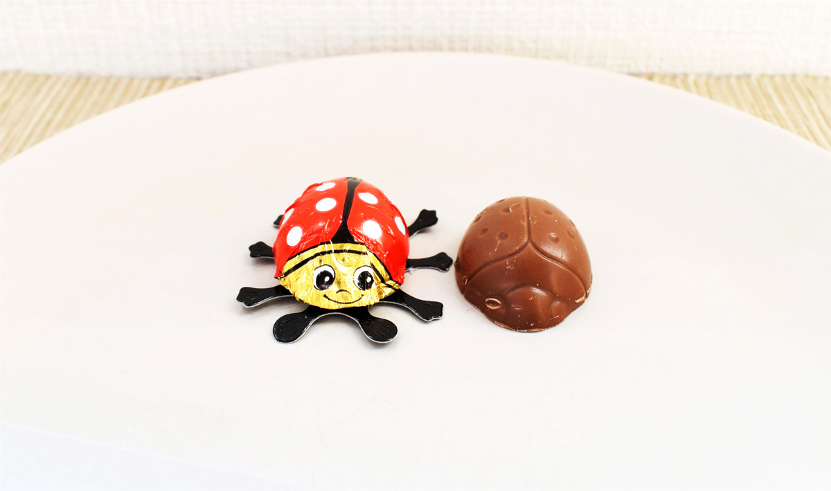 テントウムシがデザインされた包み紙の中は、まろやかな甘さのミルクチョコレート。チョコレートにもしっかり模様がついていて、かわいいですね。