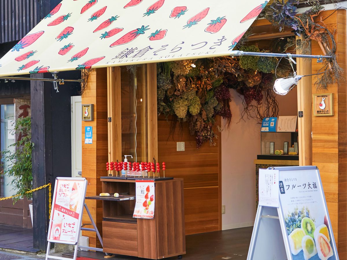 ここ鎌倉・小町通りに2020年3月オープンした「鎌倉そらつき」は、築地場外市場のスイーツ店「築地そらつき」を姉妹店とする“季節のお餅専門店”。築地場外市場で不動の人気を誇る「恋するいちご大福」をはじめ、鎌倉店オリジナルの「フルーツ大福」が楽しめます。お餅の専門店であるものの、実はイチゴを使ったスイーツも豊富なんですよ。