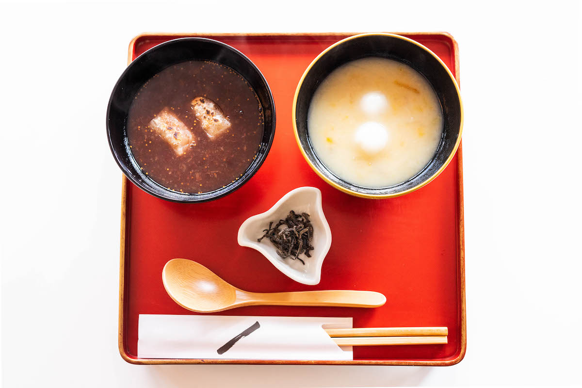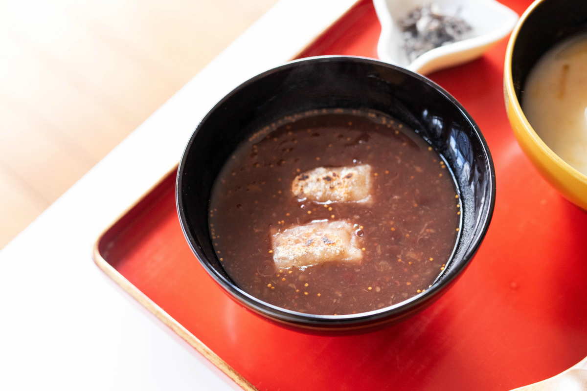 あとひとつは15種類の雑穀で仕立てた「十五穀米のぜんざい」で、つぶつぶとした食感ときび砂糖ならではの上品なコクが楽しめます。こちらは丸い焼き餅入り。