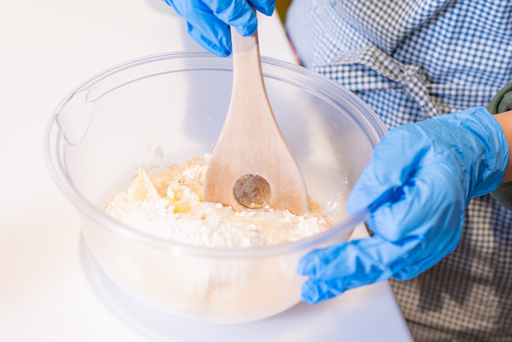 まずはパンの仕込みから。ボウルに強力粉をはじめとする材料を入れ、木べらで全体をよく混ぜます。この時、ボウルに漫然と材料を入れるのではなく、ちょっとしたコツを押さえると後の作業がスムーズになるようです。