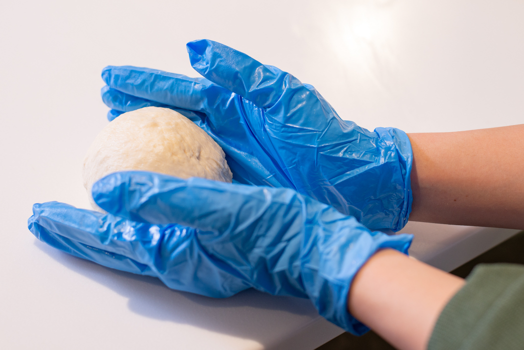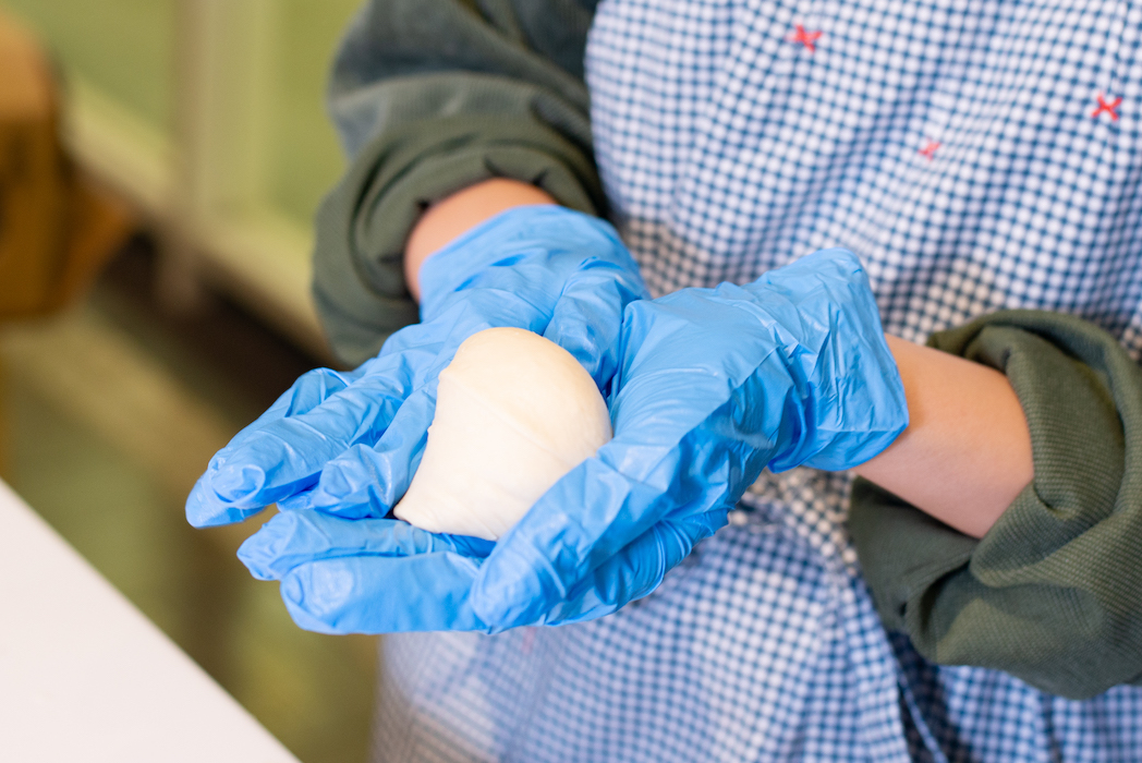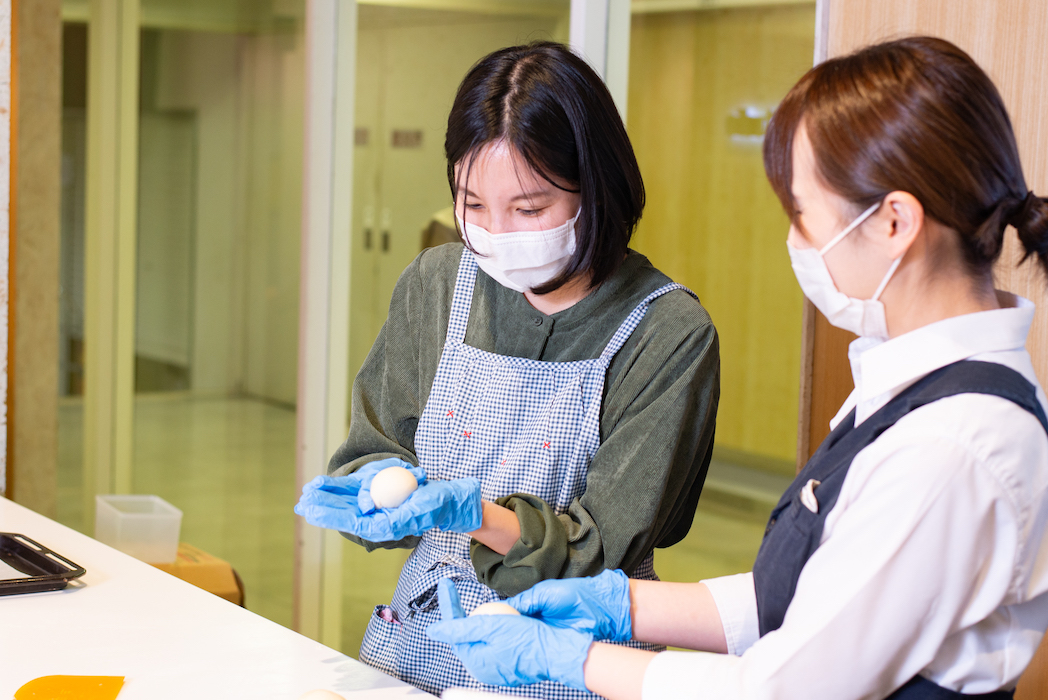 白井先生「手の平に乗せ、もう片方の手でしっかり丸め直します。できるだけ綺麗な面を残し、表面をつるんと丸め、とじめをしっかりとじましょう。綺麗に丸め直そうと思って、たくさん触りすぎてもそこでガスが抜けすぎて、生地が硬くなってしまい、伸びにくくなってしまうので注意しましょう!」