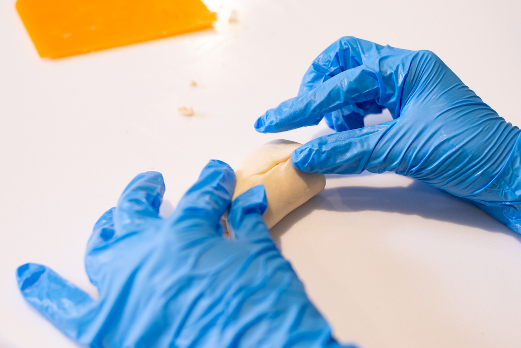 ボウルのなかで生地がまとまったら、台の上に取り出し、さらに馴染ませます。まずは白井先生が、こねる際のお手本を披露。