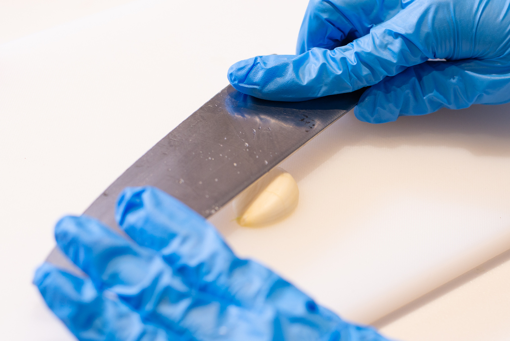 「とろ~りチーズのチキン・トマトソース」の調理もスタート。まずはにんにくの皮と芯を取り除き、包丁で押しつぶします。