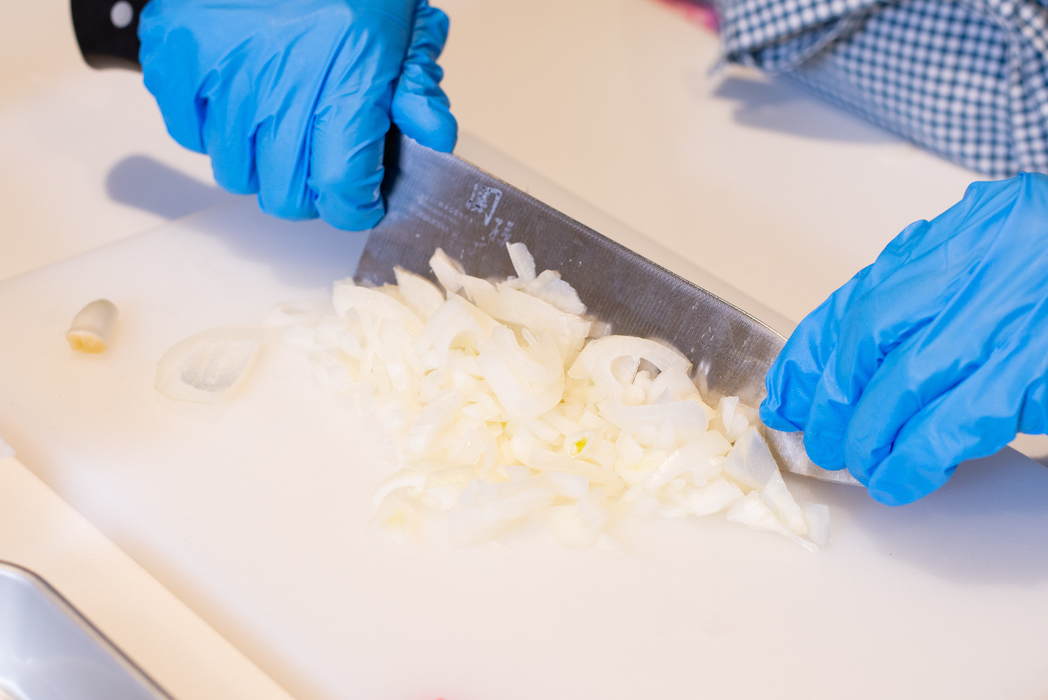 次に、玉ねぎをみじん切り。すでにABCクッキングスタジオでみじん切りをマスターしたかなごんは、手早く作業を終えます。