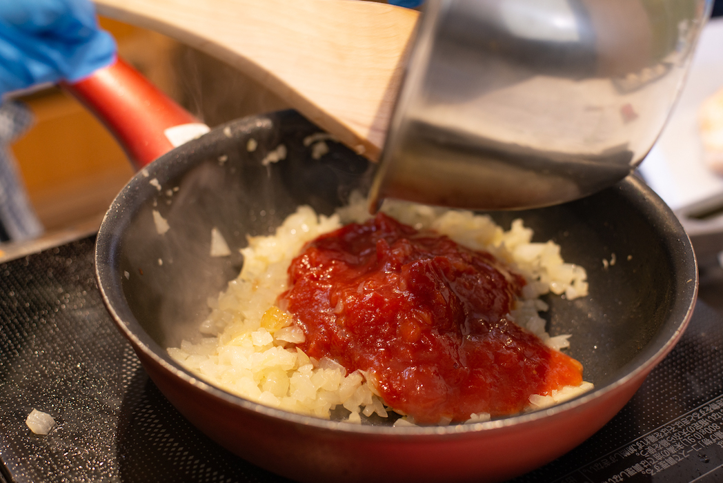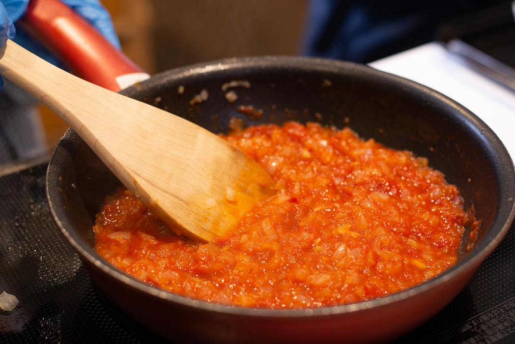 カットトマトとコンソメ、砂糖を加えてから数分煮込むと、旨みが凝縮されたおいしいソースが完成!