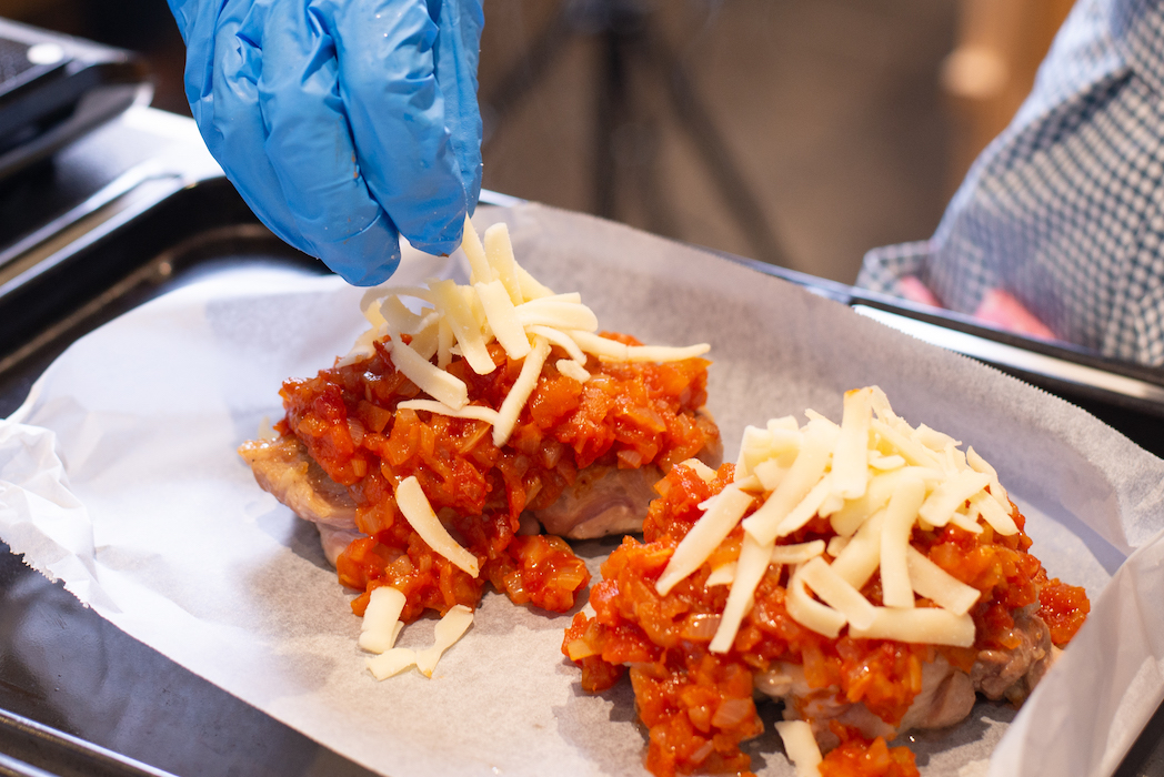 先ほど焼いたチキンにソースとチーズをトッピングし、パンと一緒にオーブンへ。