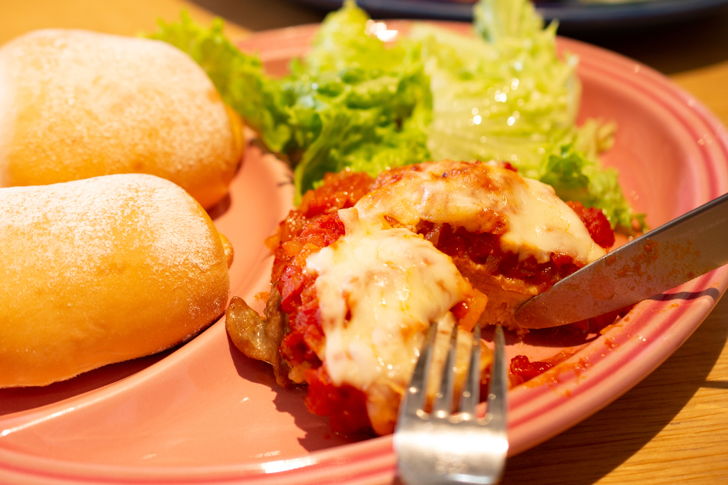 チキンはふっくらと柔らかく仕上がっており、一口サイズに切って口に入れた瞬間、その質感がダイレクトに伝わってきます。また、トマトの酸味とチーズのまろやかさが融合した味わいは、疑う余地のないおいしさです。一方のロールパンは、ほどよい湿気を含んでおり、食感がモチモチ。なおかつ、小麦の香りがしっかりと感じられ、たまりません。