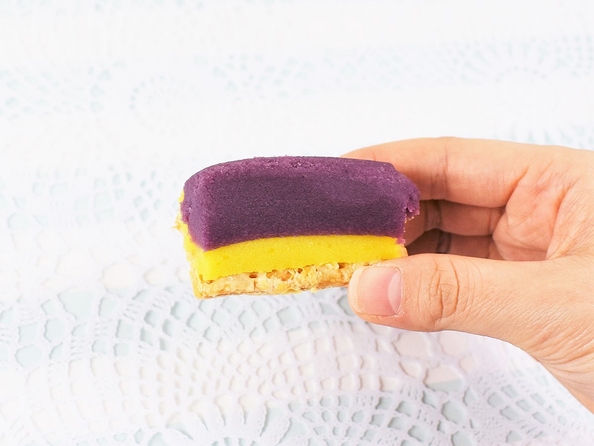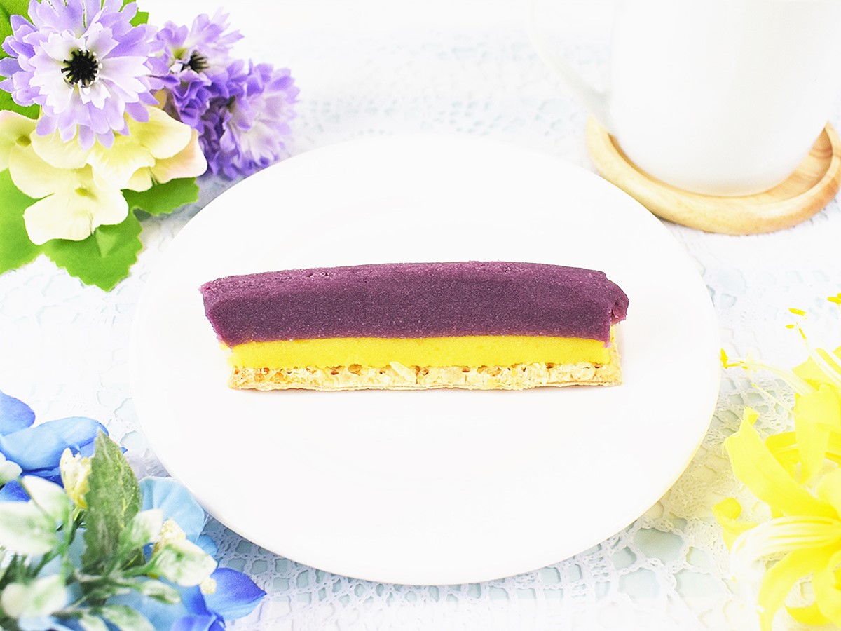 2色のコントラストが際立っているスティックタイプの「Uchi Cafe Specialite ほくとろ豊潤紫スイートポテト」。上部には彩り鮮やかな紫芋の餡、その下に焼き芋の餡が重なっています。