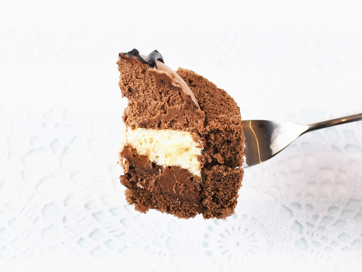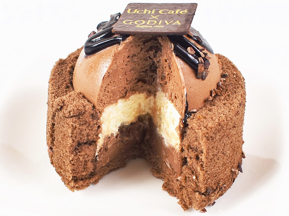 「ショコラドーム」はチョコレート生地でロールケーキに仕立てた見た目がなんとも可愛らしく、食べるのがもったいないくらいです。覚悟を決めて生地をカットしてみると、中にはチョコカスタードクリームやチョコチップ入りのバニラムースがぎっしり。またドーム状に重なったチョコムースもボリューム満点で、チョコにこだわるGODIVAらしいスイーツと呼べるのではないでしょうか。