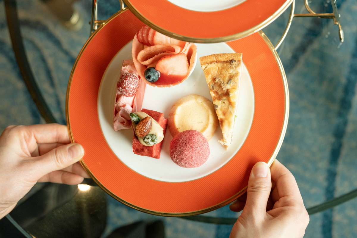 下段はいちごのクレープ、フランボワーズとマンゴーのムース、ホワイトチョコといちごのパウンドケーキ、クッキー2種(ポルボロンのラズベリー、ディアマンのプレーン)、本日のセイボリー・キッシュというラインナップ。ホテルパティシエが仕立てるスイーツの数々は、どれも繊細で丁寧な味わい。都市部の景色を優雅に楽しみつつ、おいしいひと時を過ごしましょう。