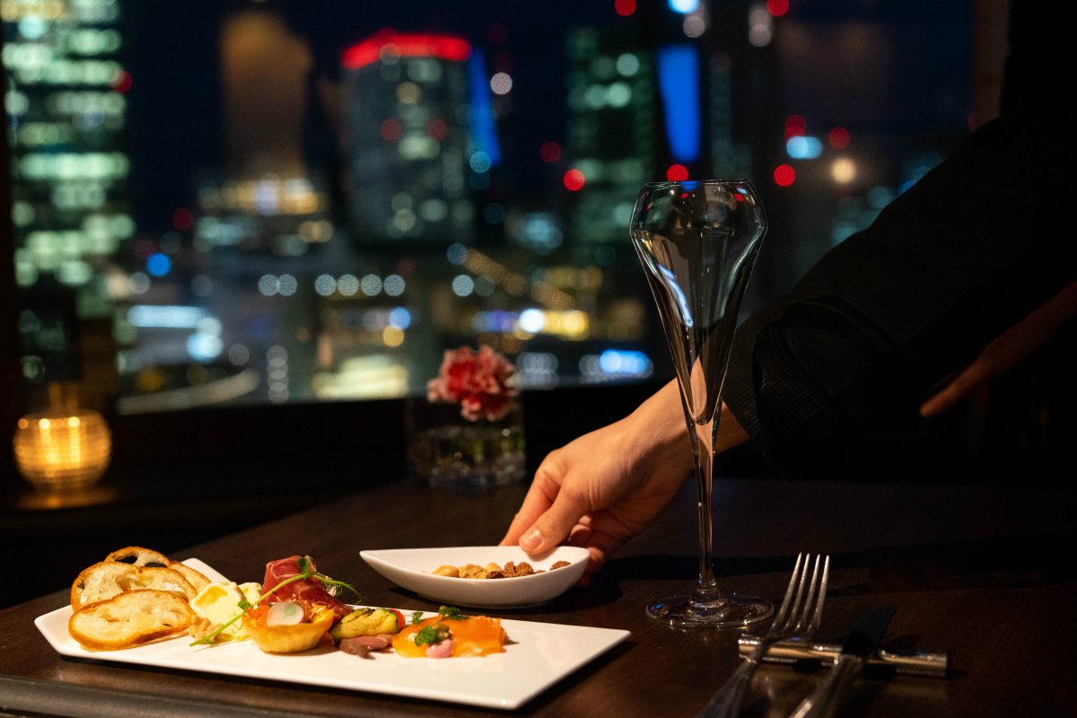 18~20時は、クラブラウンジにてカクテルタイムがスタート。本プランの利用者ほか、26F以上に滞在するゲストのみが楽しめる優雅な時間を楽しんで。窓いっぱいに夜景が広がり、昼とはまた違った特別感に包まれます。