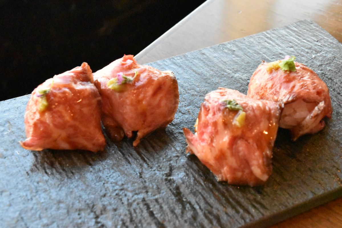 おひとり様1皿限定の「国産牛サーロインのローストビーフ手毬寿司風」は必食の一品!