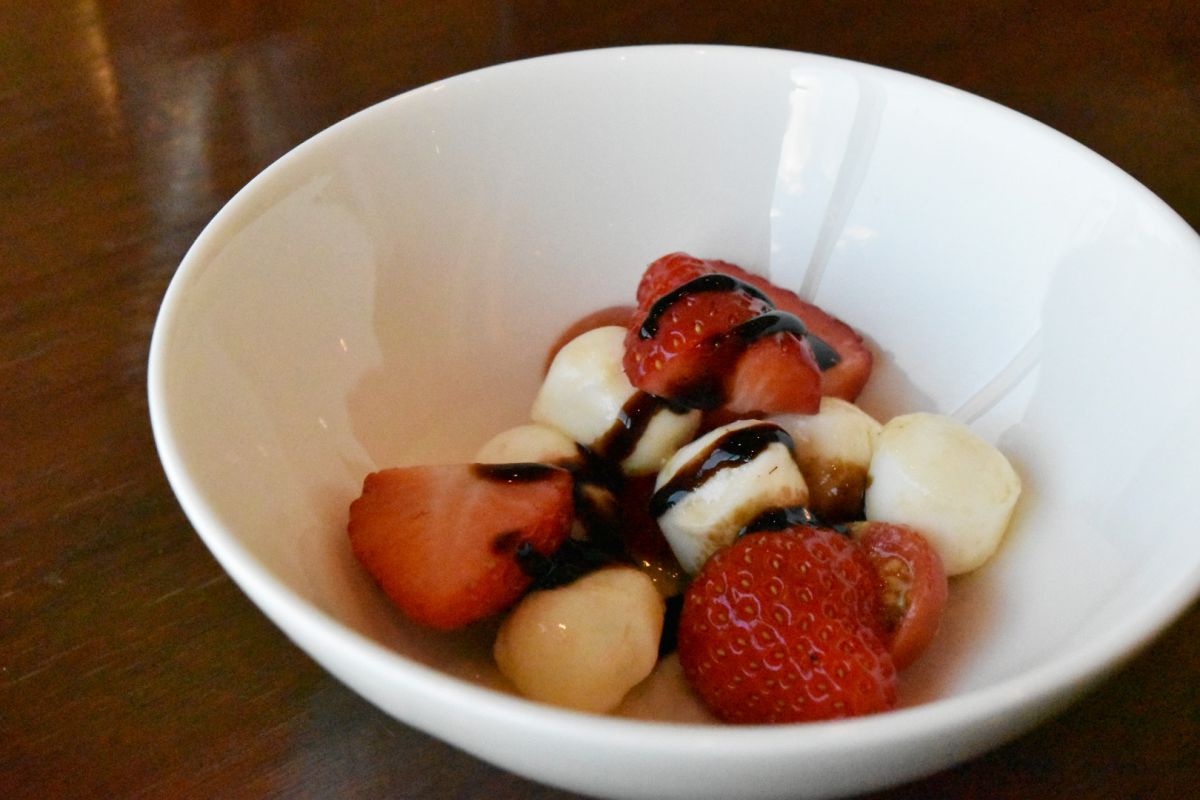 サイドメニューにも、もちろんいちごが!「苺とトマト、モッツァレラチーズのサラダ」は、いちごを野菜感覚で楽しめる一品。苺のさわやかな甘さと、濃厚なモッツァレラチーズ、さっぱりしたバルサミコソースは相性抜群!いちごの新しい可能性に出会えた一品でした。