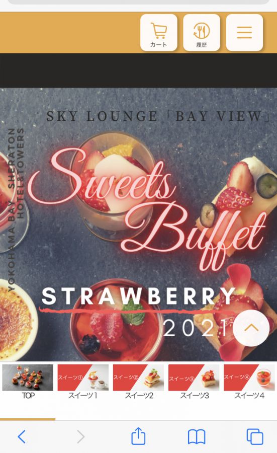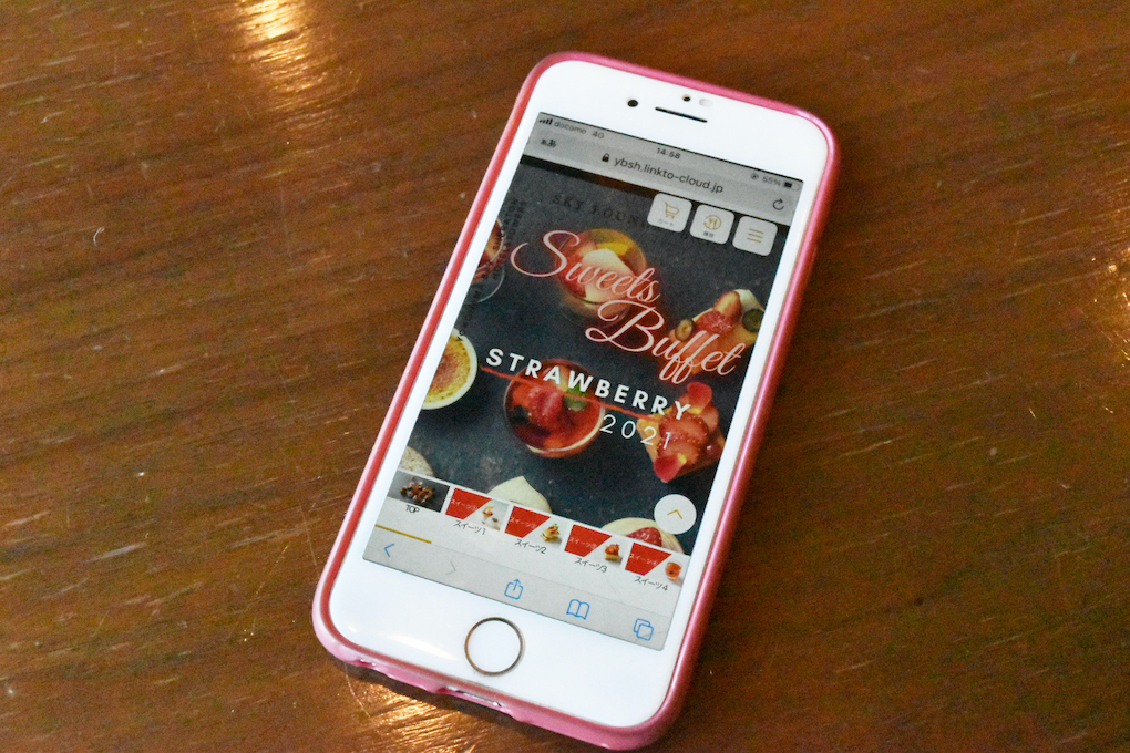 そして、今回は注目ポイントは、スマートフォンから注文ができる新スタイルの「オーダーブッフェ」ということ!各テーブルで渡されるORコードを読み取ると、写真のような画面が表示されます。ここから好きなスイーツを選んで、カートにいれて注文を確定させると、席までスイーツを運んでくれるんです。