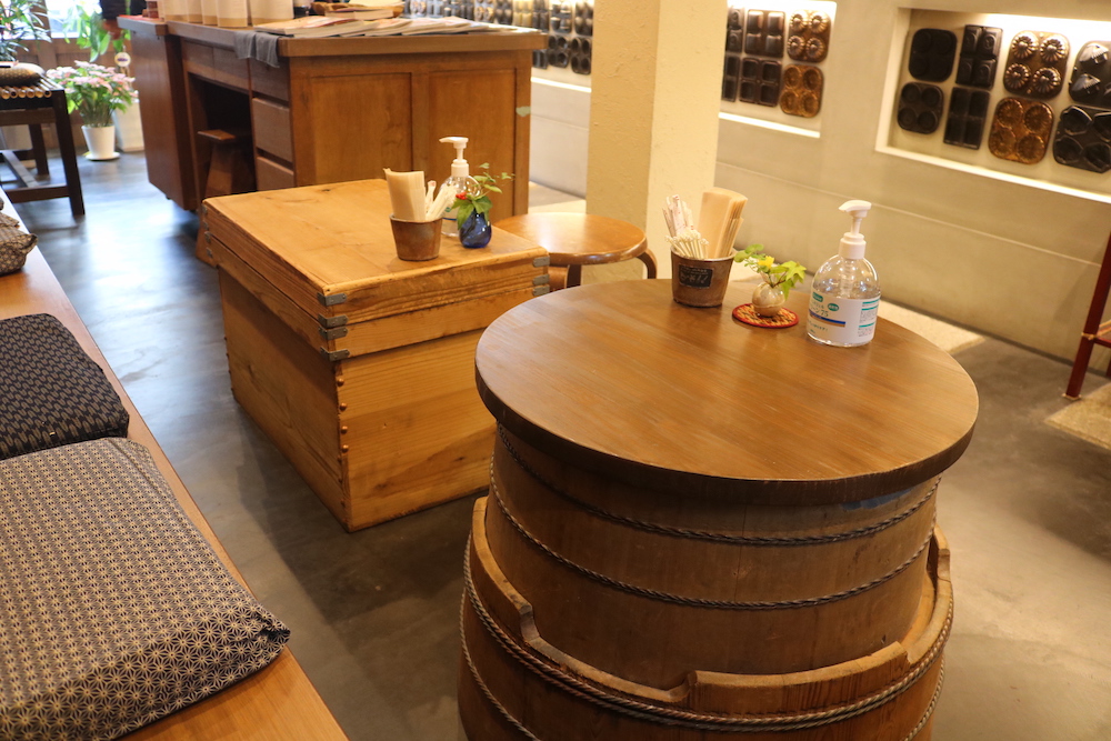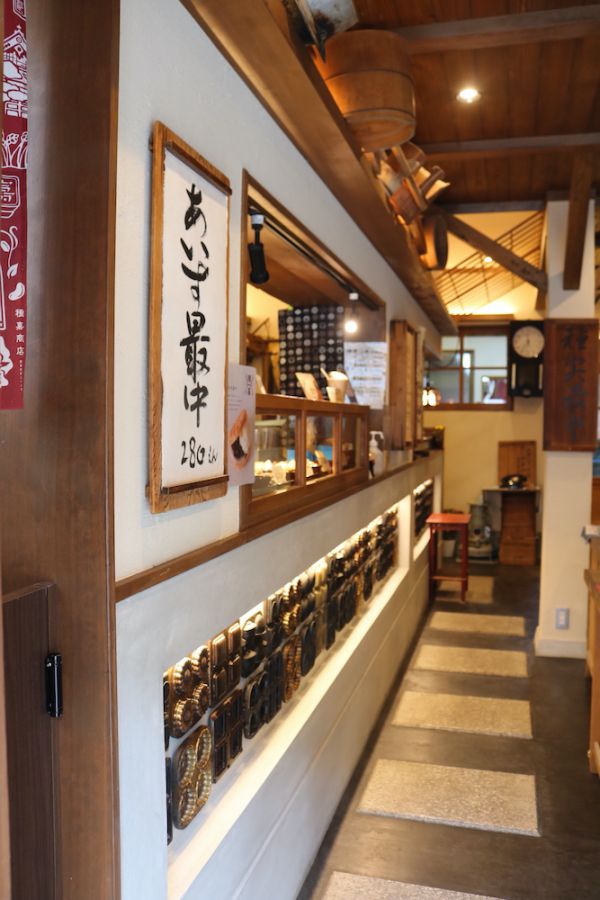 整備された大通りから歩いて3分とは思えないほど、静かな街並みに軒を構える「種嘉商店」。使い込んだ最中の焼き型をインテリアに取り込んだ、レトロさと洗練された雰囲気を併せ持つ不思議なお店です。