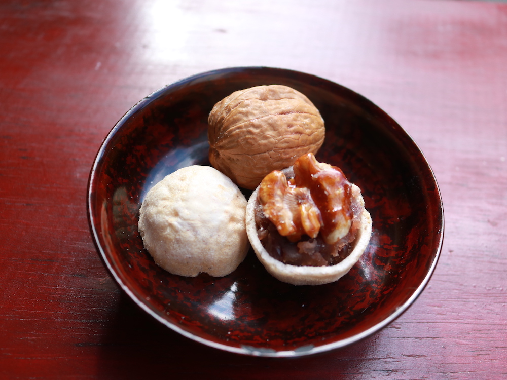 お店の看板商品は、3種類の「種実最中」。最中種が落花生(ピーナッツ)、扁桃(アーモンド)、胡桃(クルミ)そのものの形をしていて、それぞれピーナッツバター、アーモンドバター、キャラメリゼしたクルミが、あんこと一緒に入っています。種を手焼きしているのはもちろん、ピーナッツやアーモンドも店内で挽いているから、何もかもが作りたて!