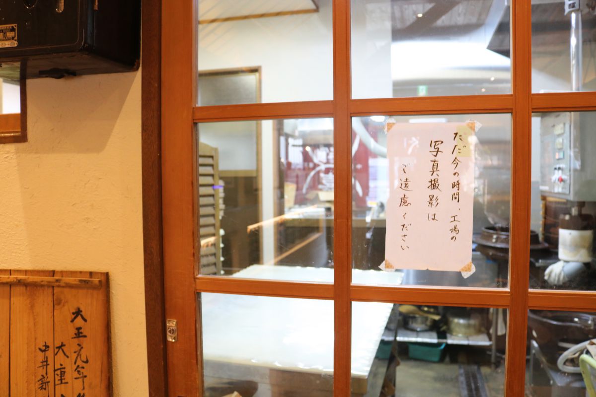 お店から見える作業スペースに特別に入らせていただきました。手前には餅をこねる機械、さらに奥に種を焼く機械があります。