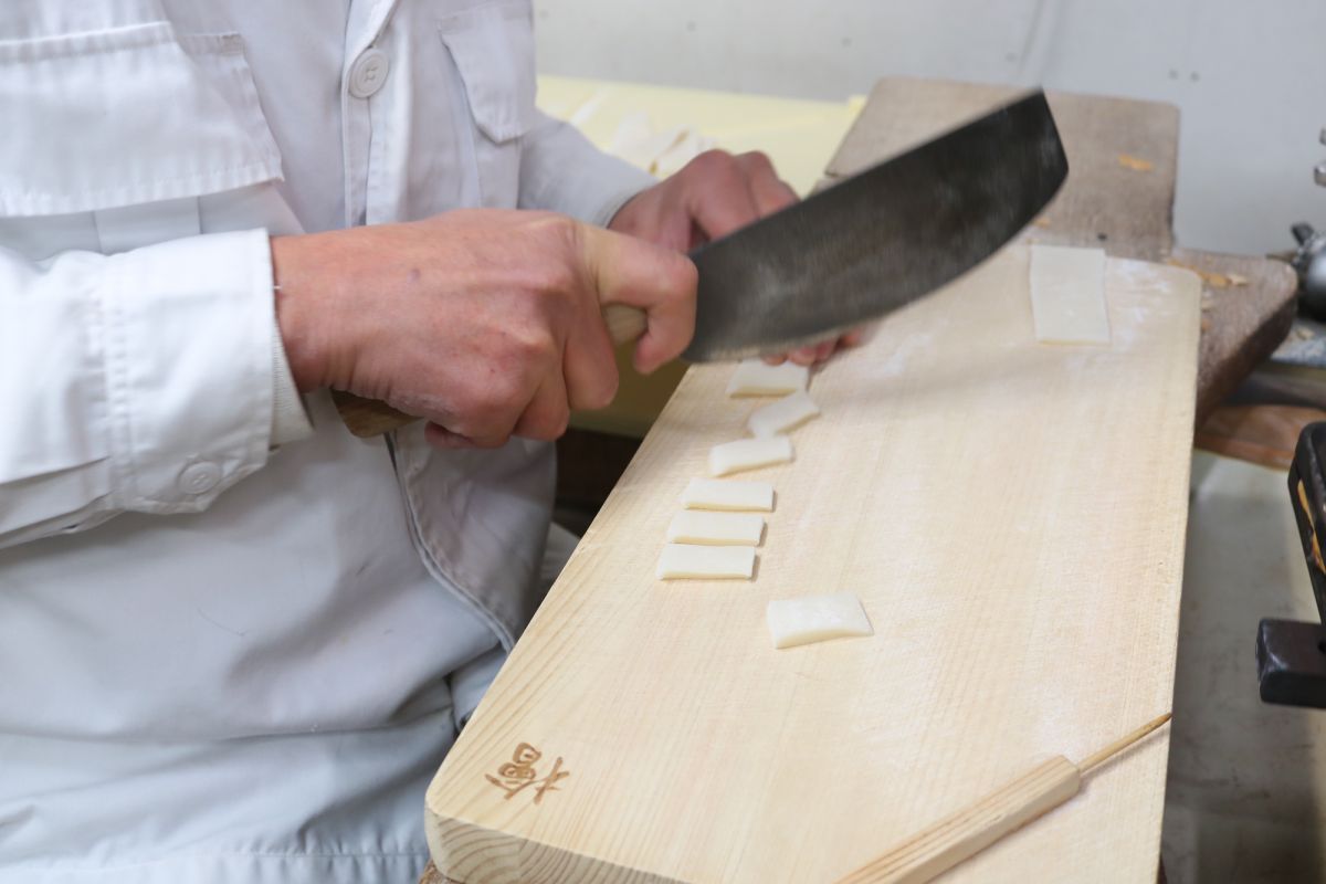 最中種は何でできているかというと、もち粉。「種嘉商店」では、最高級の近江羽二重餅の粉を使われています。薄く伸ばして小さくカットしたものを型に押して伸ばすのですが、このときの餅のやわらかさがポイント。くっつかないように、専用の種切り包丁でリズミカルに切っていきます。