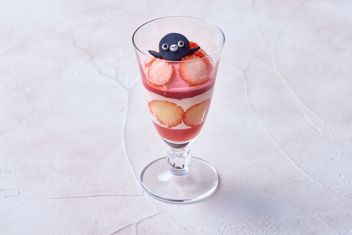 3月20日(祝日)・21日(日)は、いちごのムース、木いちごソース、マスカルポーネといちごゼリーが贅沢に4層になったかわいいミニパフェ「Suicaのペンギン いちごパフェ」。