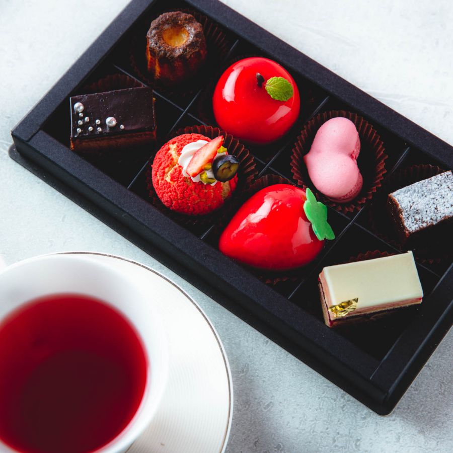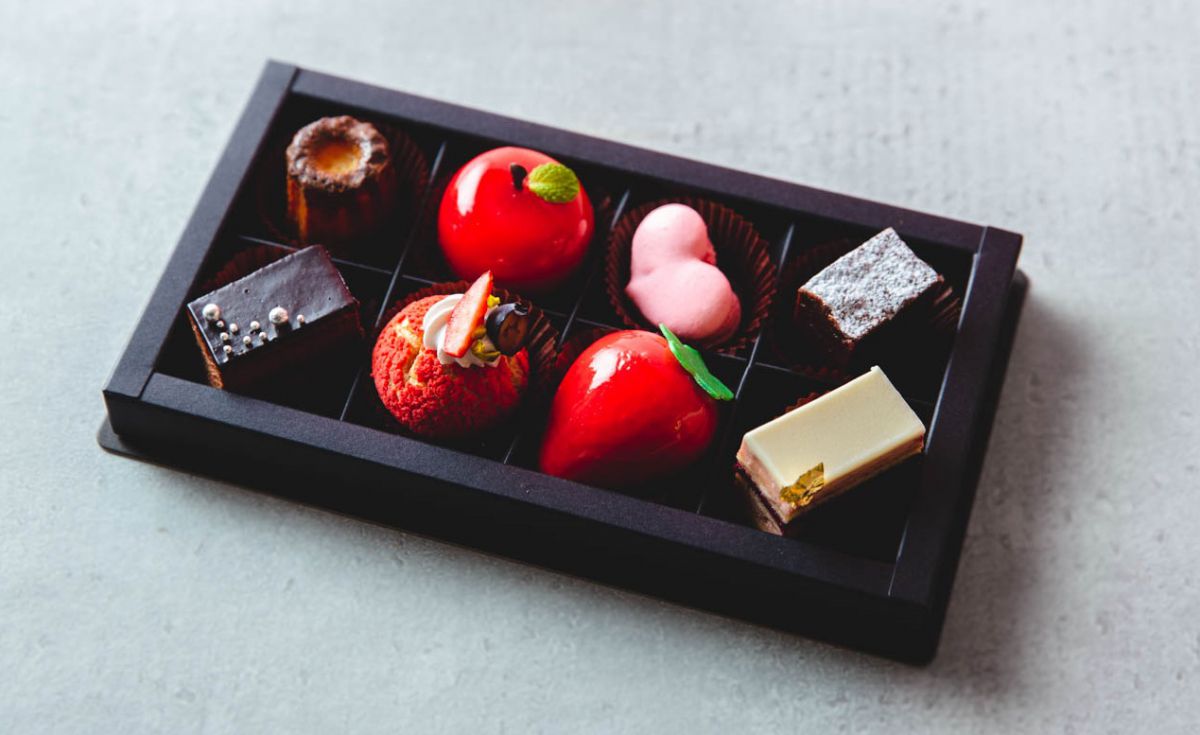 スイーツは、カヌレ、リンゴのムース、ハートのマカロン、ガトーショコラ、ミロワールショコラ、フランボワーズチョコレートのシュークリーム、苺のムース、フランボワーズのオペラの8種類。箱を開けた瞬間からワクワクが止まりません。