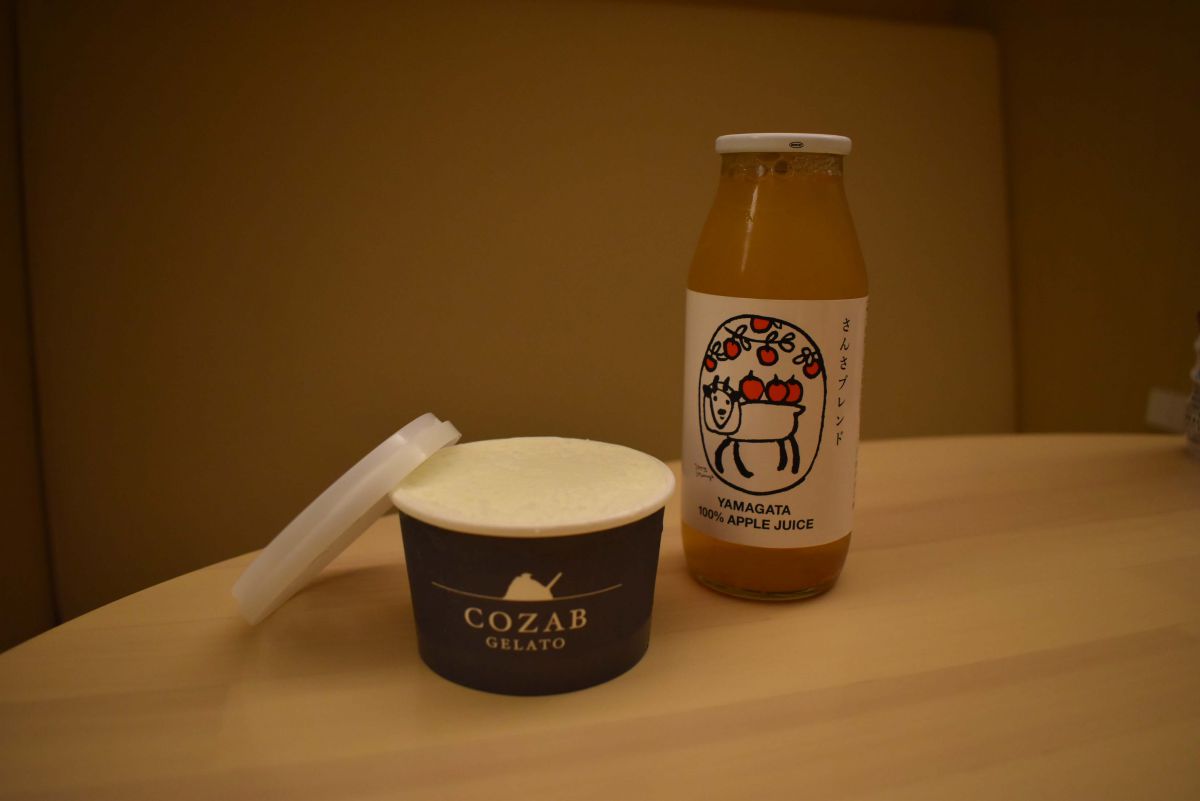 山形県飯豊町の牛乳を使ったCOZAB GELATOのミルク(500円)と、YAMAGATA 100%APPLE JUICE(380円)を買い、ワクワクでお部屋へ。