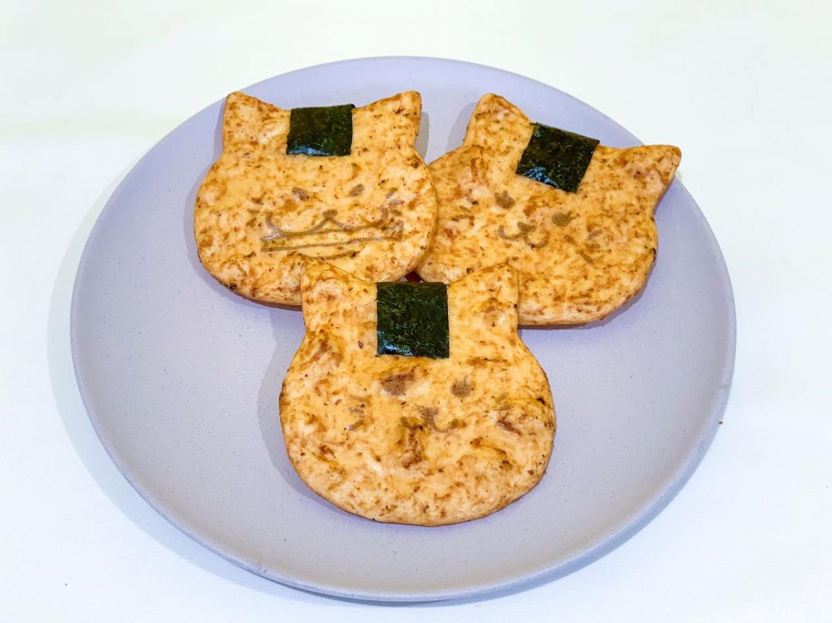 梅おかか味のねこの形のおせんべいに、海苔でブチ模様をつけた「ねこせんべい」。ごはんとしても食べられる一等米を使用し、職人が1枚1枚丁寧に型抜き、刷毛塗りをしている手作り。食べるのがもったいないほどきゅんとする3つの表情のおせんべいをセットに。バラでも販売しているので、好きな表情を選んでみて。