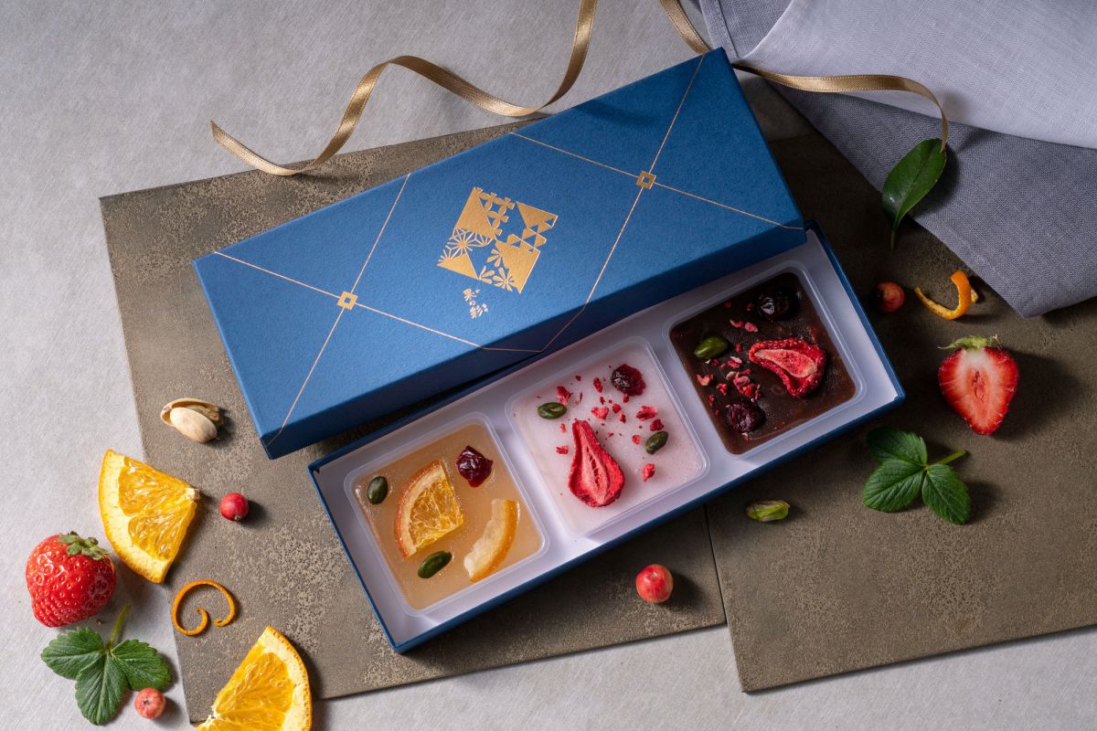 「ようかんの楽しみ方を、もっとおしゃれに、かろやかに。」というテーマのもと誕生した、和菓子と果実を彩り豊かに織りかさねた新しいようかんの形「果の彩」。タブレット状の薄く作ったようかんと、ドライフルーツやナッツを合わせ、果実の香りや食感が“綾(あや)をなす”新感覚の一品。「果の彩」は 1箱に、だいだい・うすべに・しょこら の3つのお味が入って1620円です。