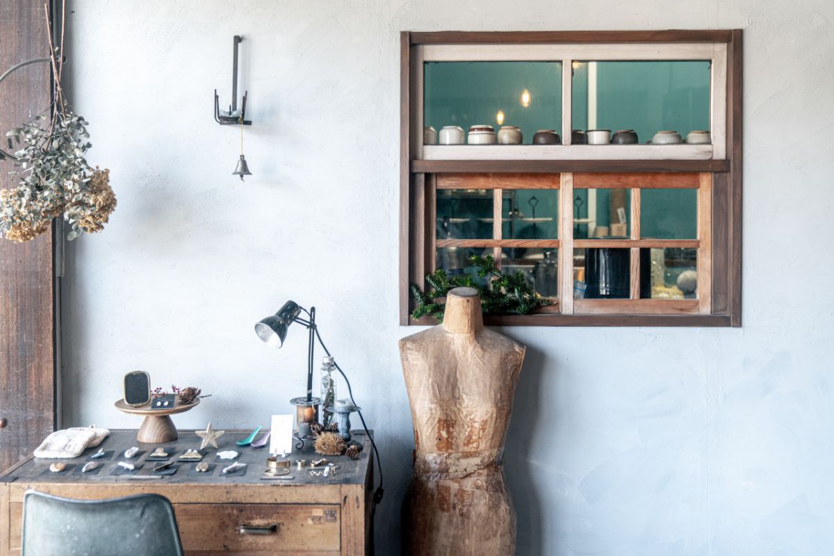 広々とした木造の店内、大きなガラス戸から差し込む光に照らされた古い木肌のテーブルが並び地元で活躍する作家の器やアクセサリーなどギャラリーとしても楽しめる空間になっています。