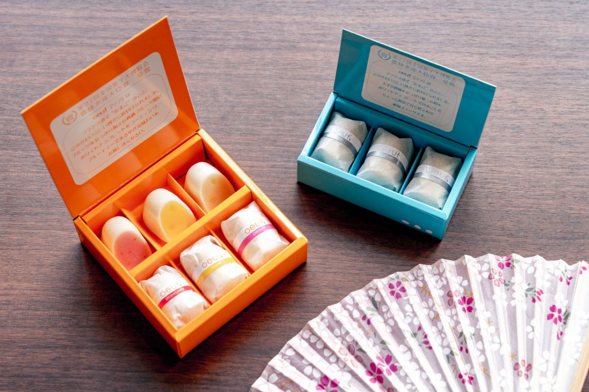 パッケージが可愛い「oeuf(ウフ)」は「巣ごもり」をコロンと小さな一口サイズに仕上げた新しいバージョンなのだそう。プレーンな味の「ピュア」(青色)とフレーバータイプの「フルーツ」(オレンジ色)の2種類、小さな小箱に入っているので嵩張らず見た目にもGoodでお配りにも自分用にもおすすめ。