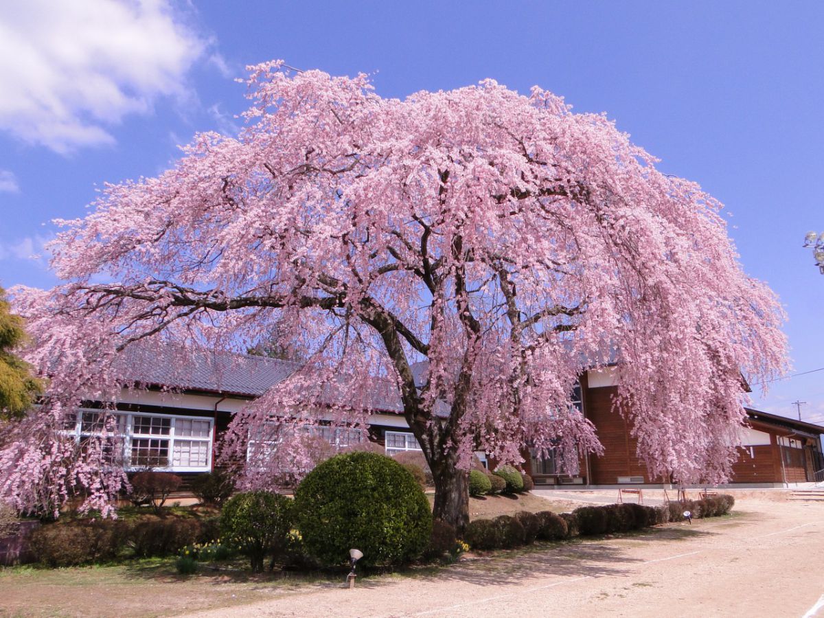 昭和24年に山本中学校として建築された「杵原学校」。吉永小百合さん主演の映画『母べえ』などのロケ地としても使用された建物は国登録有形文化財だそうです。春になると、校舎前の枝垂れ桜を楽しめる名スポット。