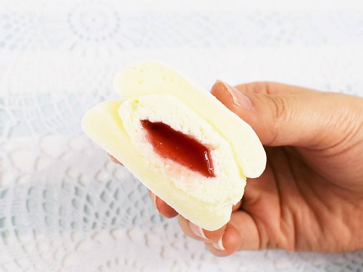 パッケージから取り出した「ふわまろレアチーズ」は、一口でいただくよりもやや大きいサイズ。レアチーズクリームを覆う白玉生地が“繊細”と呼べるほど柔らかく、ちょっと力を入れただけで潰れてしまいそうなほどでした。