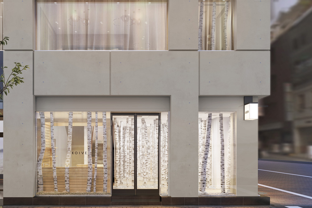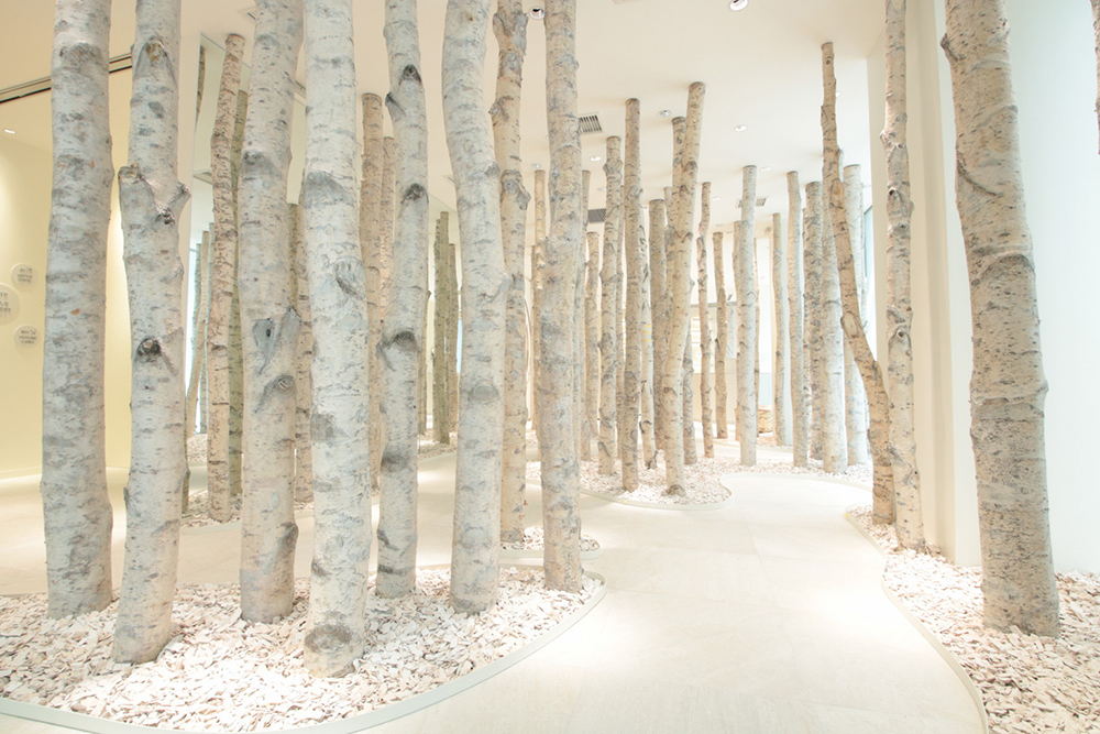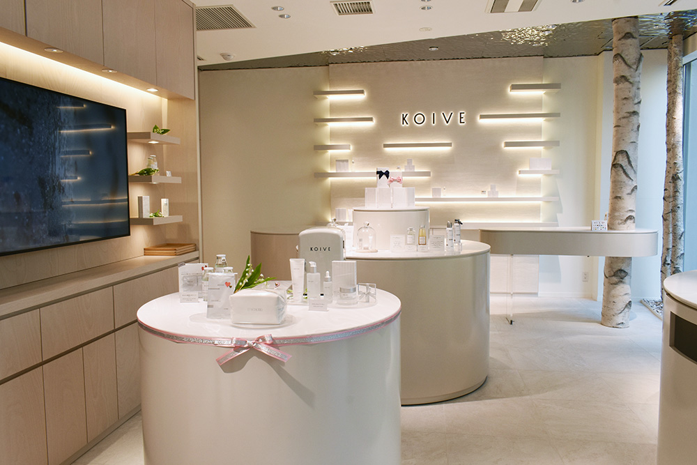 1階は白樺樹液を使ったスキンケアブランド「KOIVE」のフラッグシップショップとなっており、白樺の大樹たちがお出迎え!