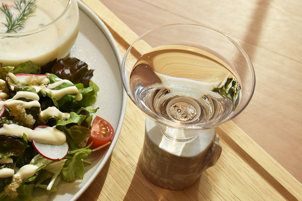 透明で少しとろみのある白樺樹液は、ほんのり甘く優しい味わいです。樹液を飲めるなんて「KOIVE CAFE」ならではの貴重な体験!グラスにもこだわっていて白樺をイメージした特注の有田焼を使用しています。