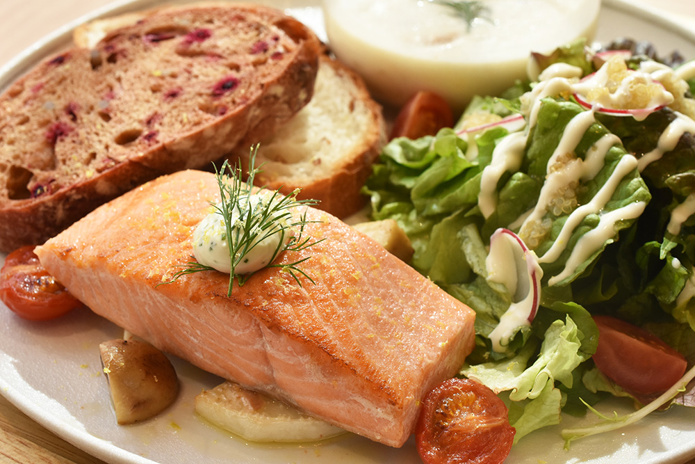 サーモンソテーは絶妙な塩加減がライ麦パンと相性抜群!クリームチーズにディルを練り込んだ爽やかなソースで、肉厚でジューシーなサーモンもさっぱりと食べられます。