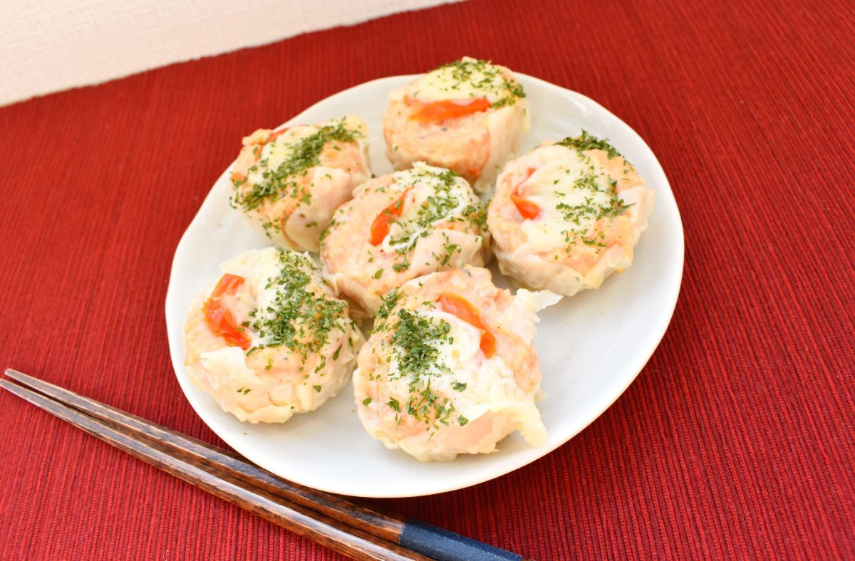 鶏むねのひき肉に、トマトや、モッツァレラチーズ、バジルなどをトッピングしたイタリアンテイストの焼売。