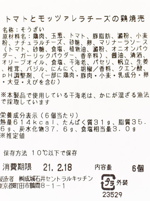 まず、第3位! おしゃれなルックスが目を引く「トマトモッツァレラチーズ鶏焼売」6個入り539円。成城石井には数種類の焼売がありますが、女性を中心に人気があるのが、テレビでもたびたび紹介されている、こちらの商品です。