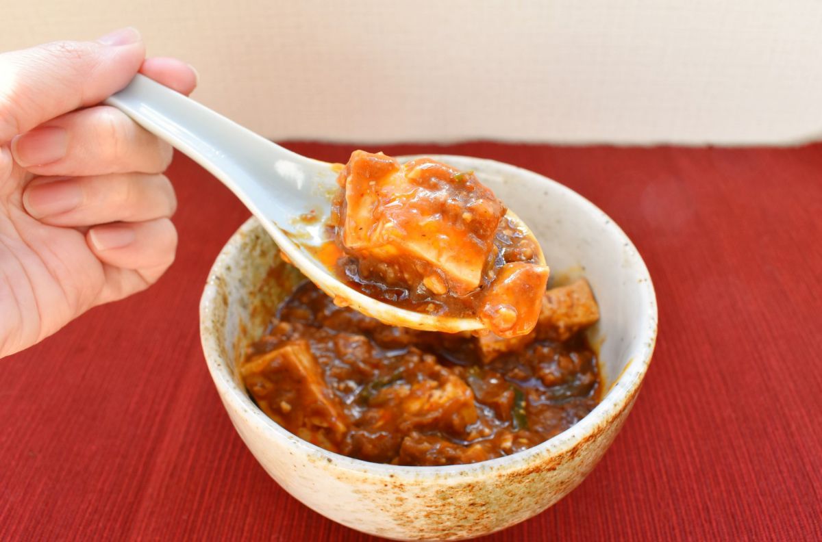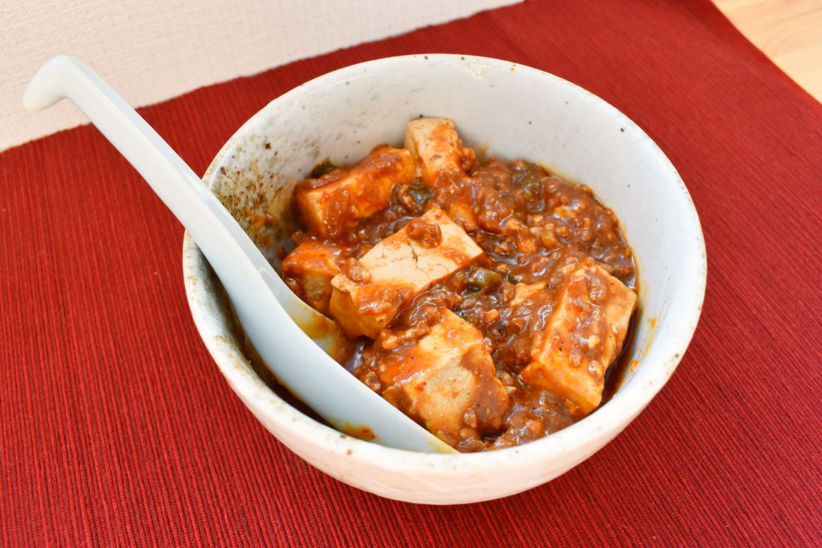 豆腐はしっかりとした硬さの木綿豆腐。豚ひき肉もたっぷり入っているので、食べごたえがありますよ。