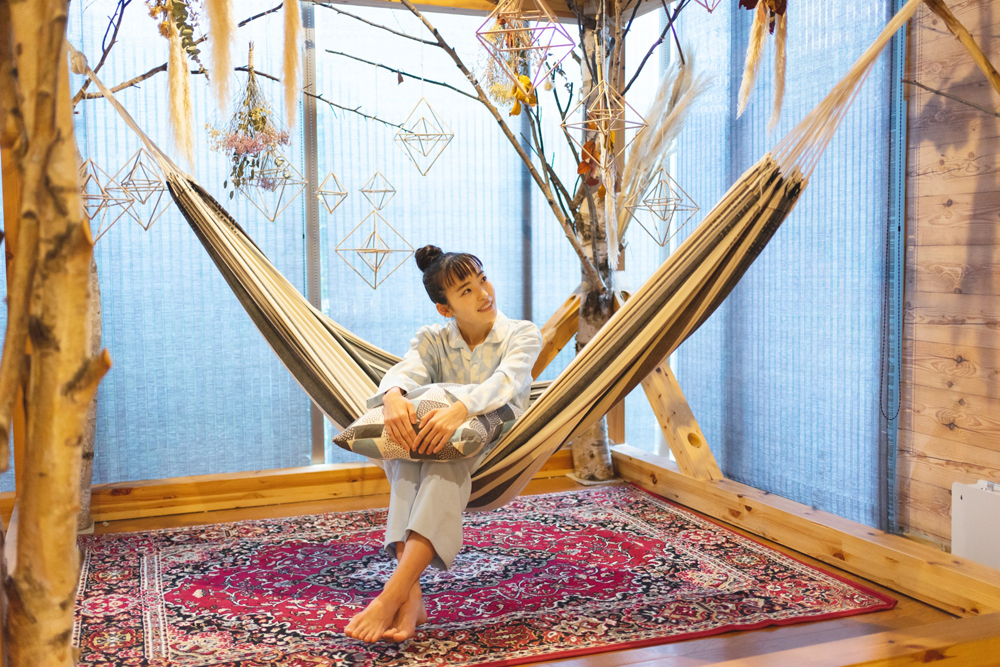 「おふろcafé utatane」ではサウナだけじゃなく、お風呂の外でも北欧気分に浸れちゃう♪館内着はフィンランドのインテリアブランド「KAUNISTE(カウニステ)」。ハンモックに揺られながら漫画や読書を1日中楽しめます。
