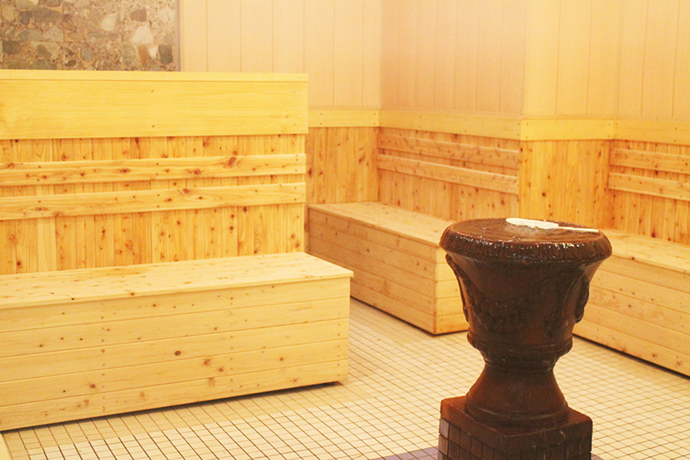 ハマムとはアラビア語で“熱い空気・湯の供される場”の意味。約50℃の蒸気で満たされた室内で、40℃ほどに温めた大理石の台に寝そべって発汗を促すのが伝統的なハマム浴です。こちらでは木の葉型のスチームベッドを用いて身体を温めていきます。