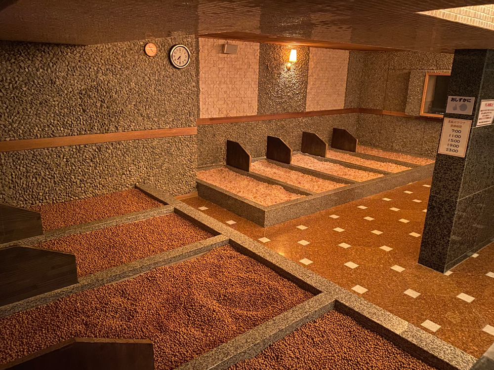4つ目の「麦飯石サウナ」はいわゆる岩盤浴タイプ。入館料にプラス200円(税別)で使用可能です。韓国蘆花島(ノファド)の海底800mから採掘した麦飯石は、強い遠赤外線効果を持っているので50℃と低温ながらも身体がポカポカ温まります。