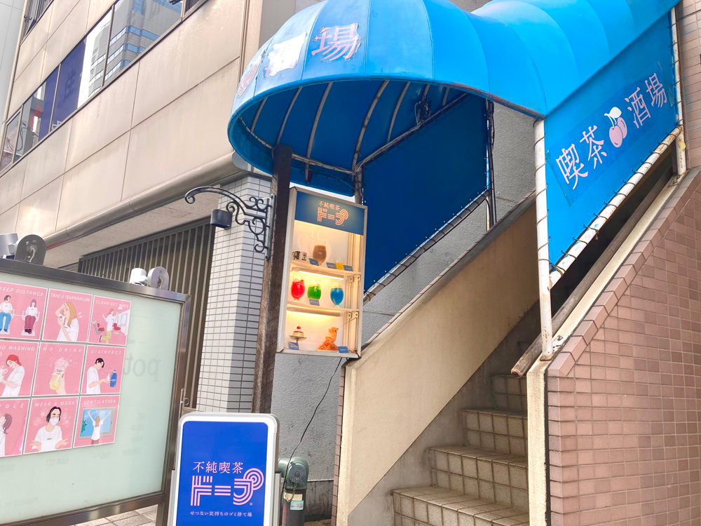 「不純喫茶ドープ」は中野駅から徒歩6分のビルの2階にあります。青い屋根にピンクの配色が既にノスタルジック。