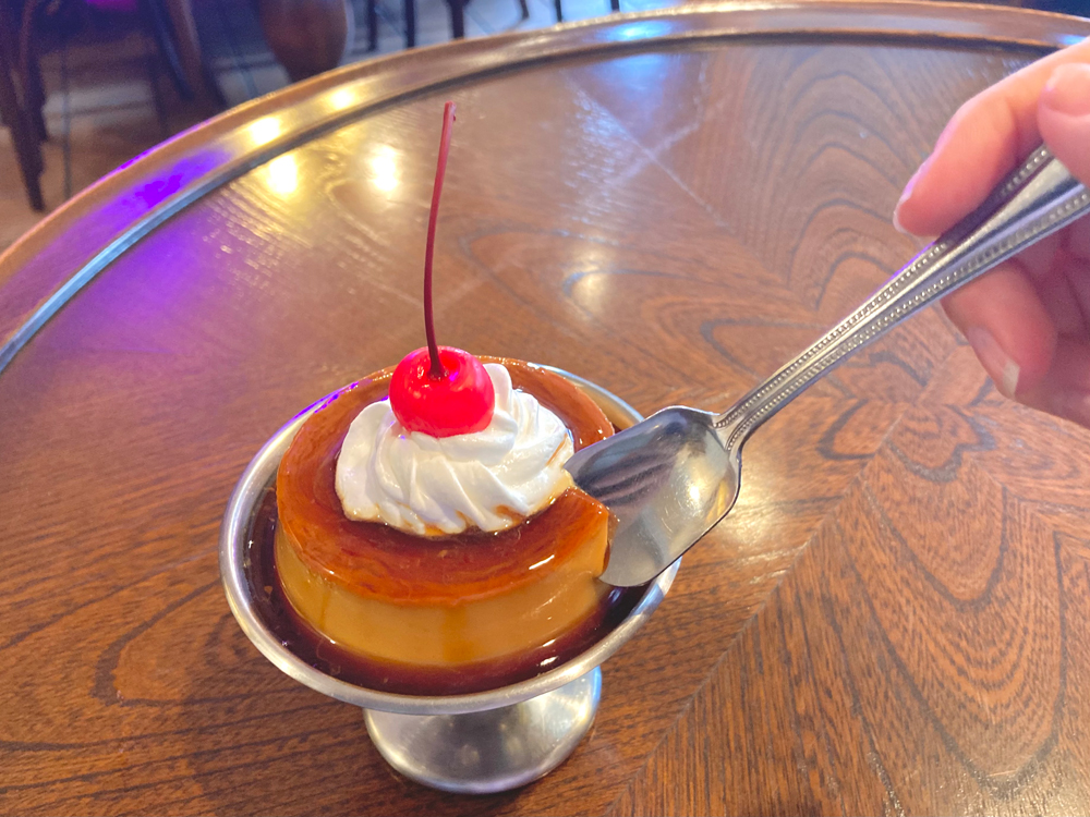 プリンはかためのしっかり食感!スプーンを入れるとその重量感におどろきます。たまごの優しい甘みが口に広がり、甘めのカラメルとのバランスが◎