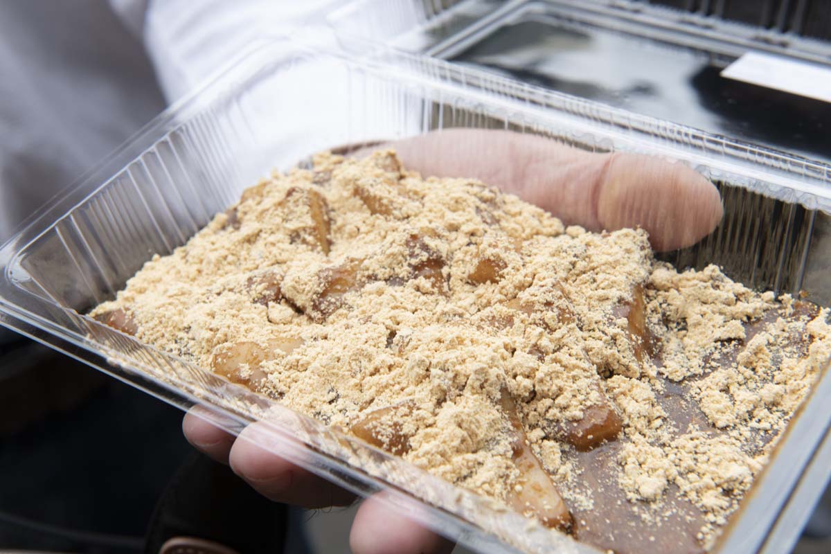 そして、きな粉と黒蜜の絶妙なハーモニーはあと引くおいしさ。「蝋金」は三角のお餅を黒蜜、きな粉の順にまぶしますが、黒蜜ときな粉の量、つける順番などお店によって異なり、福井に行ったら、その違いもぜひ試してみたいものです。